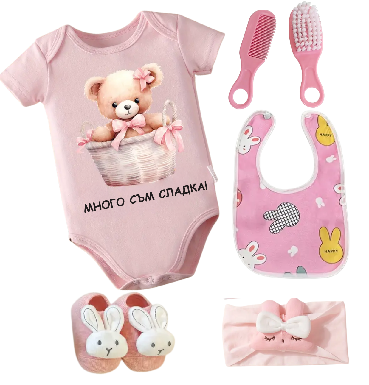 Бодито с мече и надпис „Много съм сладка!“ ще се превърне в любимата дрешка за фотосесии, а аксесоарите добавят както удобство, така и стил. Всичко е поднесено в елегантна подаръчна кутия с панделка – готова за поднасяне.