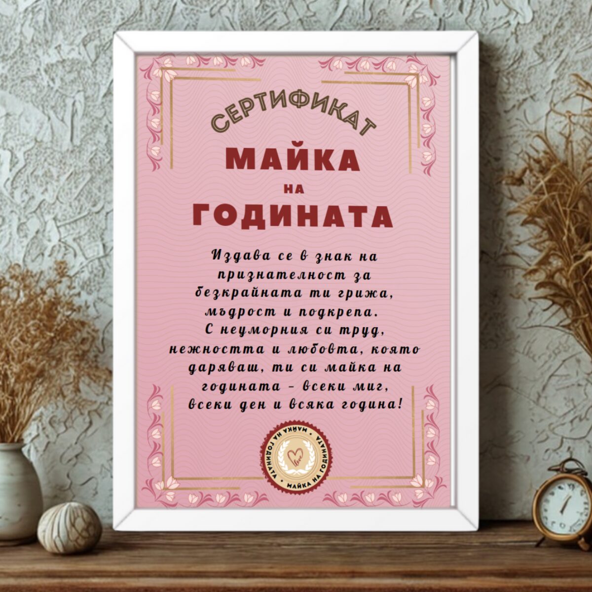 Искаш да покажеш на мама колко много я цениш? Този сертификат в рамка е мил и трогателен жест за жената, която винаги е до теб – с обич, грижа и всеотдайност.